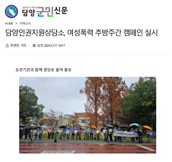 Á¦ ¸ñ ´ã¾çÀαÇÁö¿ø»ó´ã¼Ò, '¿©¼ºÆø·ÂÃß¹æÁÖ°£ Ä·ÆäÀÎ ½Ç½Ã' ÀÛ¼ºÀÏÀÚ 2024-10-21 Á¶È¸¼ö 400 2024³â ¿©¼ºÆø·ÂÃß¹æÁÖ°£(11.25~12.1)À» ¸Â¾Æ ¡®¿ì¸® ÀÇ °ü½ÉÀ¸·Î ÇÔ²² ¸¸µå´Â ¾ÈÀüÇÑ ÀÏ»ó¡¯À̶ó´Â ÁÖÁ¦·Î Áö³´Þ 27ÀÏ ¿ÀÀü ´ã¾çÁß¾Ó°ø¿ø¿¡ ¼ ¹Î&°ü&°æ ÇÕµ¿ °Å¸® Ä·ÆäÀÎÀ» ½Ç½ÃÇß´Ù.